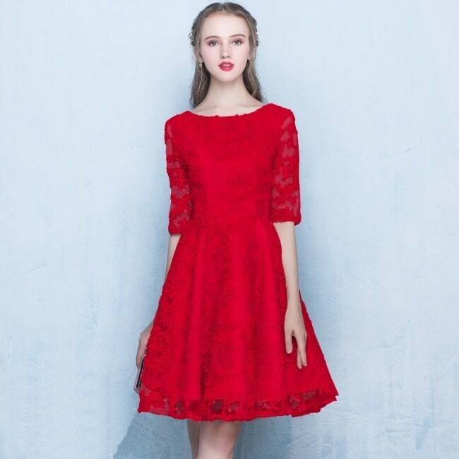 パーティードレス レース 刺繍 5分袖 ボートネック ショート フレア Aライン ミニ丈 膝上丈 5色 フェミニン エレガント パーティー 女子会 結婚式 二次会 お呼ばれ ワンピース フォーマル 2018年新作 婚活パーティー 披露宴 ウェディング 謝恩会 卒業式 入学式 演奏会