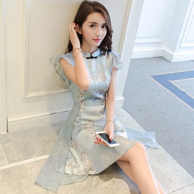 パーティードレス 花柄 半袖 ショート ミニ丈 フレア フリル チュール ハイネック チャイナカラー フェミニン エレガント パーティー 女子会 結婚式 二次会 お呼ばれ ワンピース フォーマル 2018年新作 婚活パーティー 披露宴 ウェディング 謝恩会 演奏会